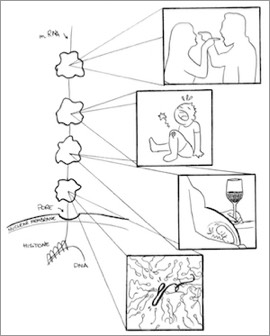 Par exemple, les traumatismes psychologiques sont stockés au niveau cellulaire dans des ribosomes et des brins d’ARN coincés dans la membrane cellulaire, ce qui est dû à des dommages épigénétiques.